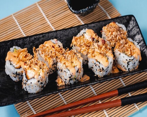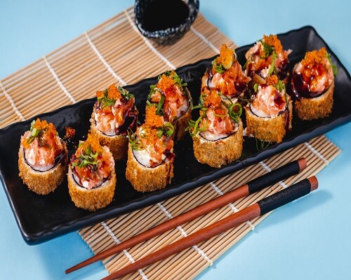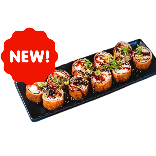 Rice, salmon, cream cheese, teriyaki topped with crispy onion.0