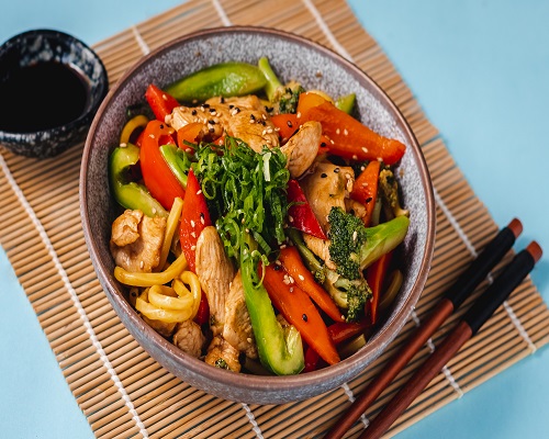 noodles and assorted vegetables with chickenSelect Hot Roll