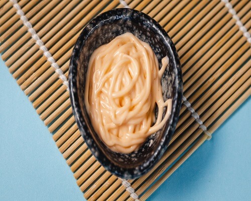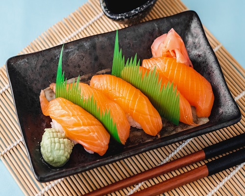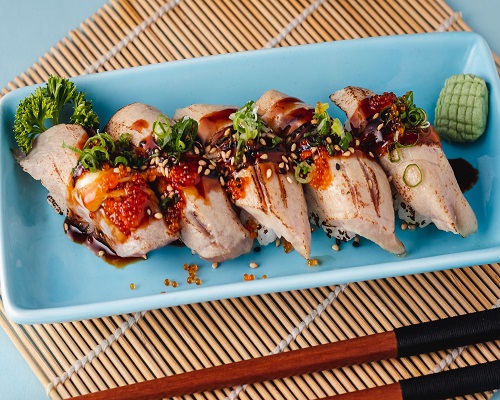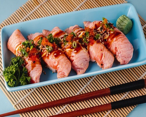 5 pcs of salmon nigiri topped with truffle infused mayo and teriyaki.0
