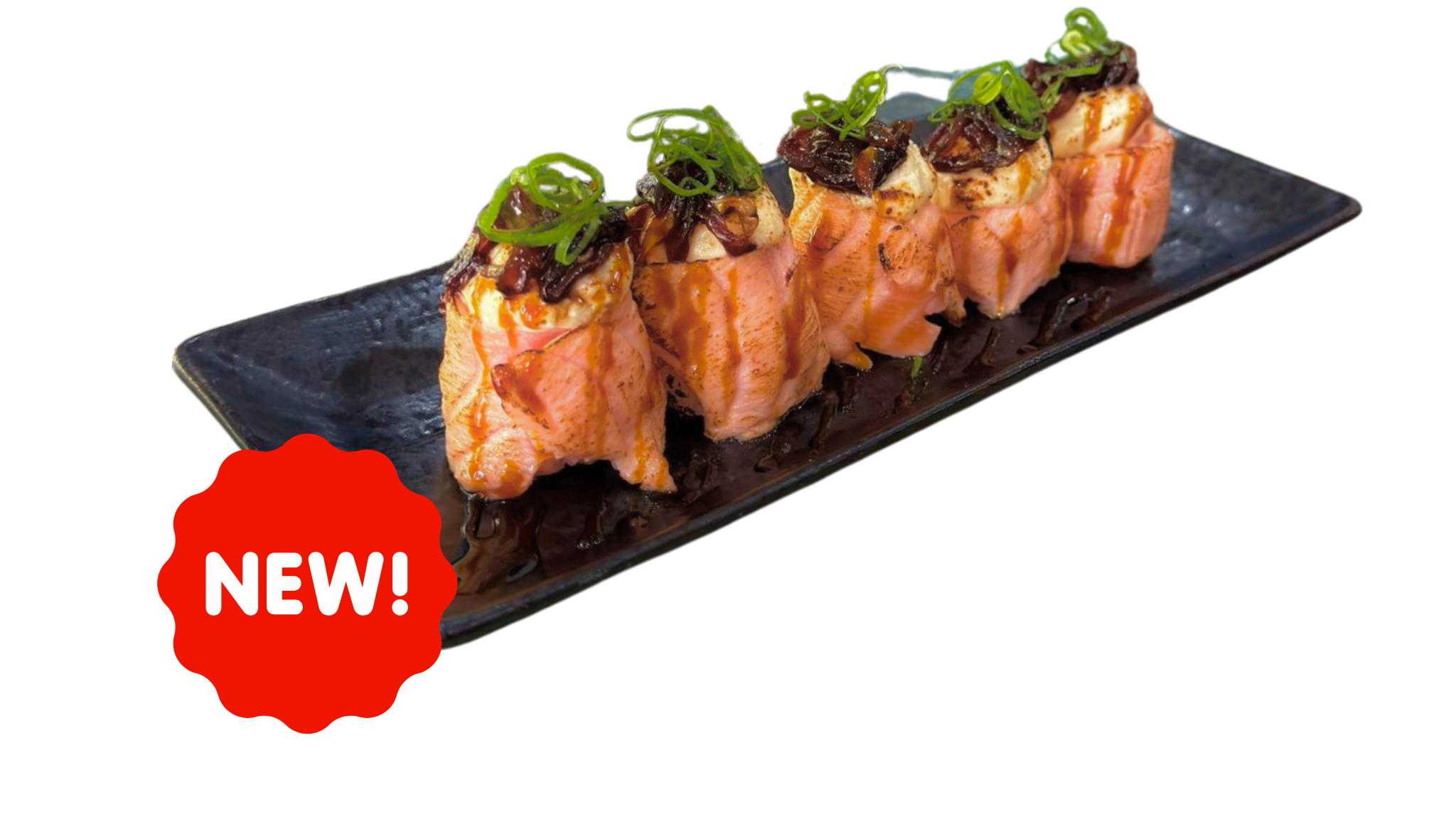 Torched Salmon (5pc), sweet soy sauce and crispy Onion Gunkan$16.50Rice, salmon, cream cheese, teriyaki topped with crispy onion.×