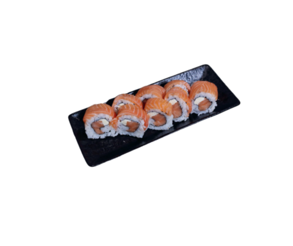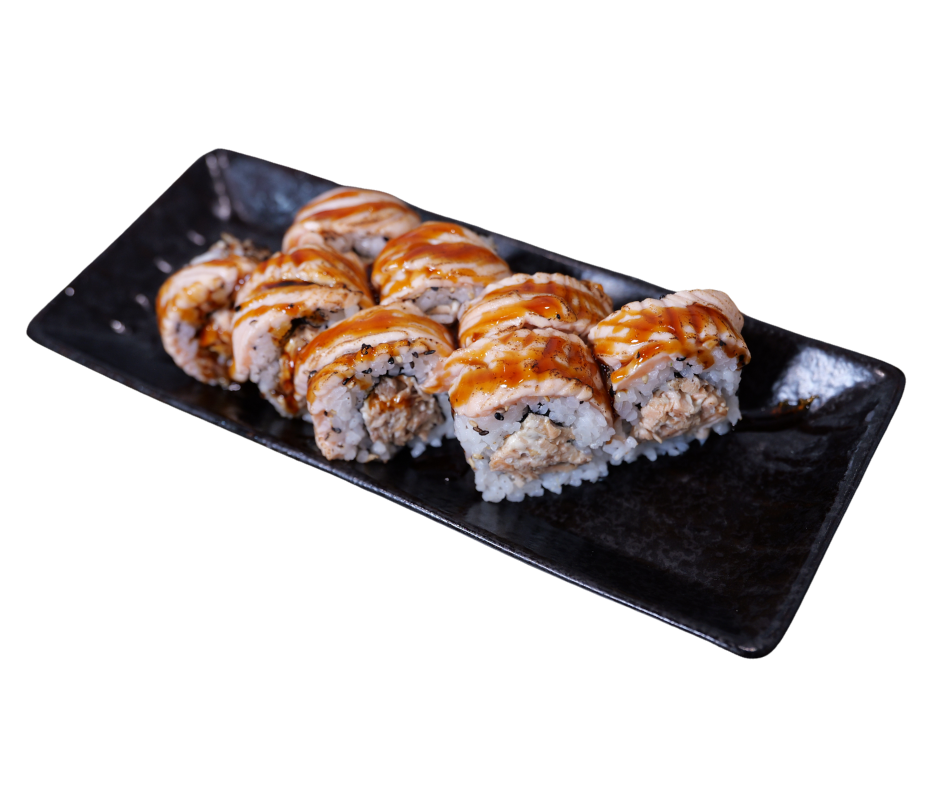 8 pcs of cooked salmon and cream cheese uramaki topped with torched salmon slices, teriyaki.0