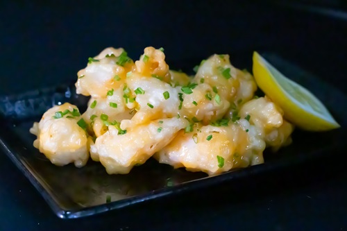 Popcorn Shrimp$15.50110 grams of Fried tempura shrimp coated in spicy mild mayo. Served with chives and lemon.