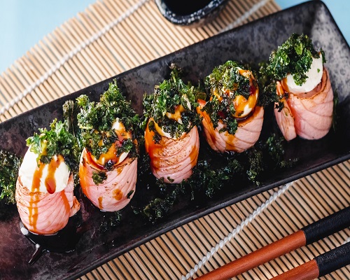 Rice, salmon, cream cheese, teriyaki topped with crispy kale.0