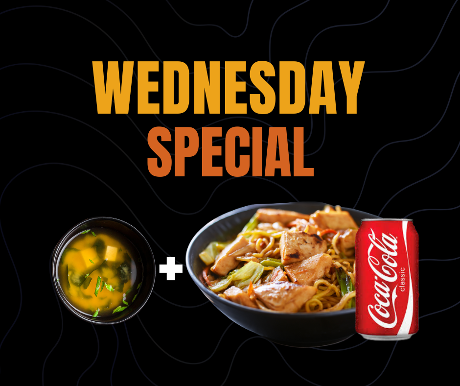 Wednesday Special$19.901 Miso Soup + 1 Yakisoba + Drink, starting at only $19.90.