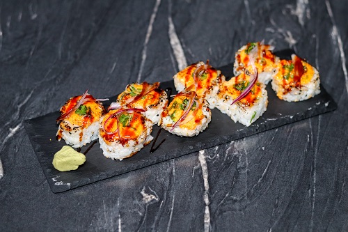 Rice, salmon, cream cheese, teriyaki topped with crispy onion.0